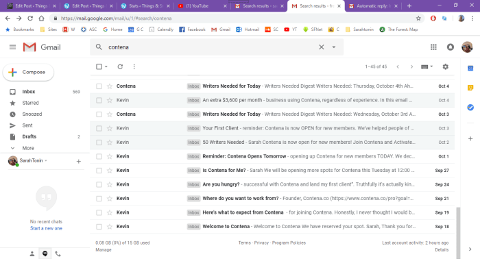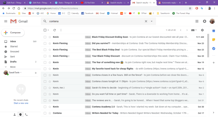 Life gets in the way, and I find myself writing this post almost a month later to me replying to their email. Since then however, I have received no response, yet no end in the ever incoming stream of emails, an additional 9 emails, making this a total of 45 emails received since Sept 18th. I’ve included screenshots to show titles to of these emails, my favorites being ‘Contena Closes Tonight!’ followed by an email 6 days later like nothing had happened.